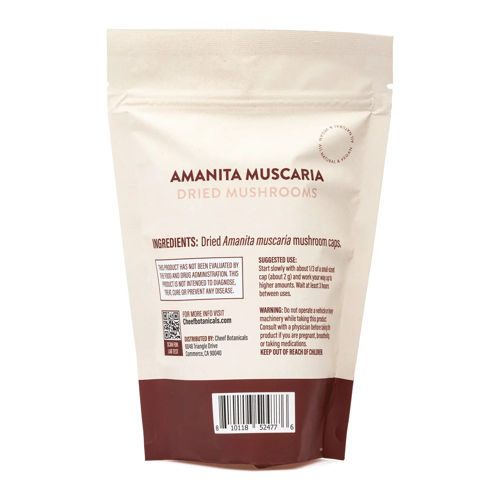 Each 1 ounce bag contains dried Amanita Muscaria mushrooms. The amount of muscimol and ibotenic acid may vary from mushroom to mushroom depending on size. It is recommended to start with ⅓ of a smaller cap (approximately 2 grams). Wait three hours, and if there are no effects, then eat another ⅓ of the cap. As consumers become more familiar with the effects of Amanita Muscaria, larger amounts can be eaten. All products are third-party lab-tested to ensure quality, efficacy, and potency.