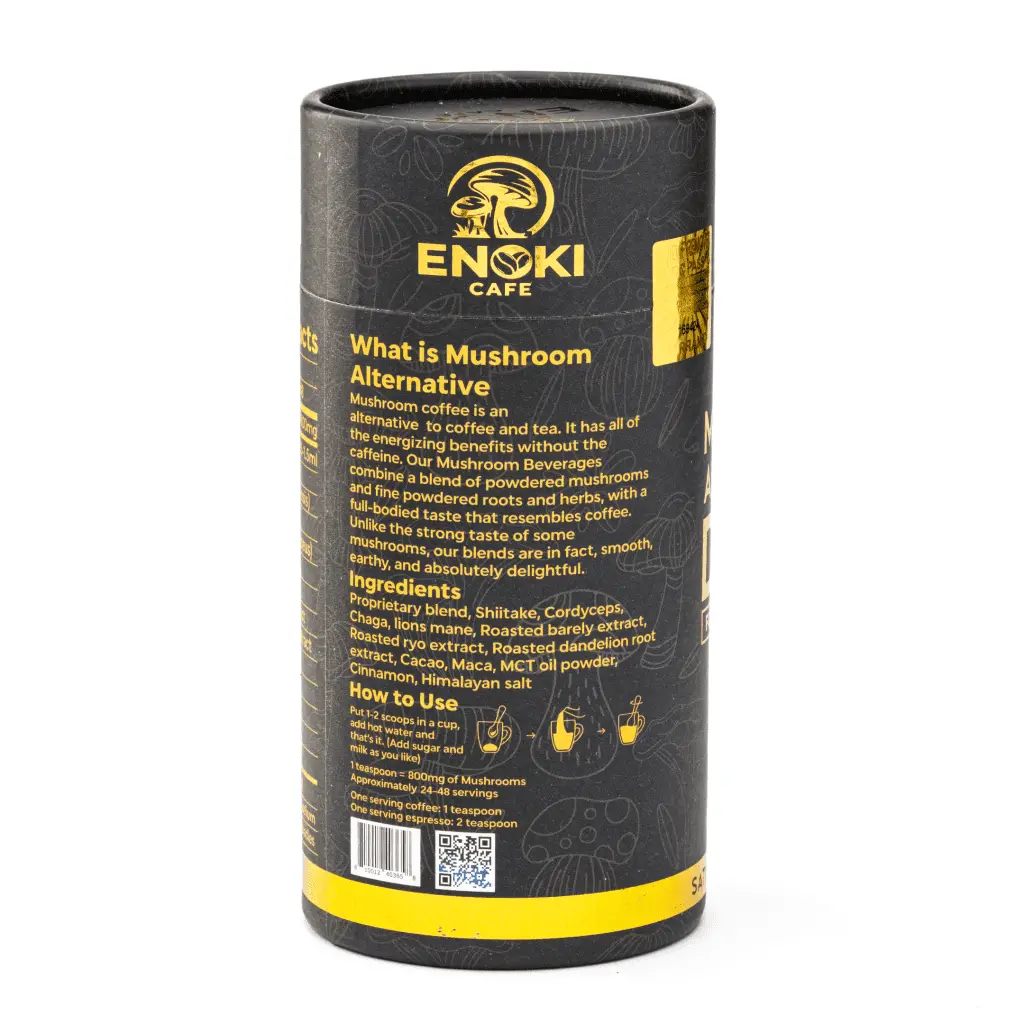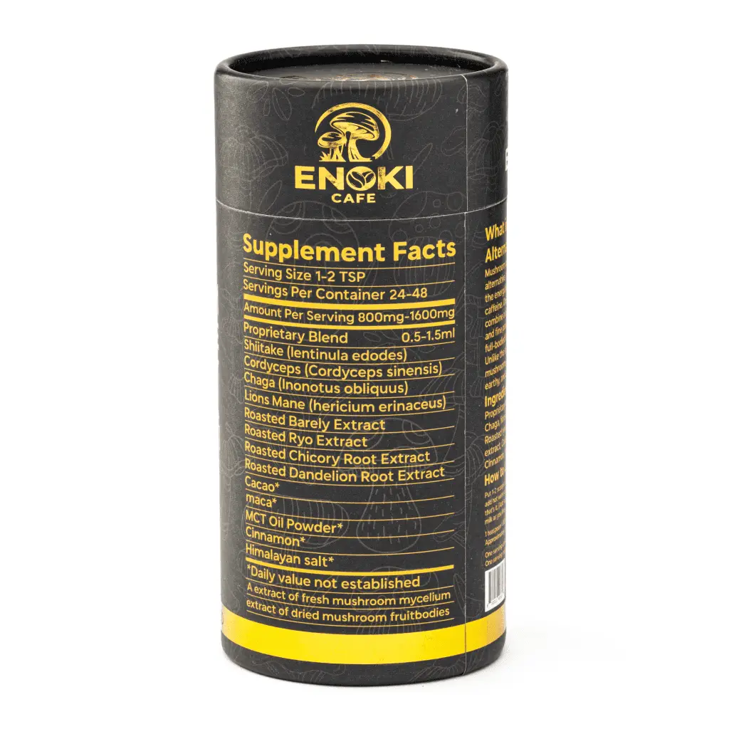 This Enoki Cafe Mushroom Alternative Drink can replace your morning coffee, letting you start your day with the power of natural caffeine. It’s powered by functional mushrooms, including Shiitake, Cordyceps, Chaga, and Lion’s Mane varieties. Medicinal mushrooms may boost your immune system and enhance your focus and creativity. In addition, this flavorful, unique beverage is vegan, gluten-free, non-GMO, and contains no high fructose corn syrup. One serving is 1-2 tablespoons mixed into water, and each container holds 24-48 servings. Each one-tablespoon serving contains approximately 800 mg of functional mushrooms.