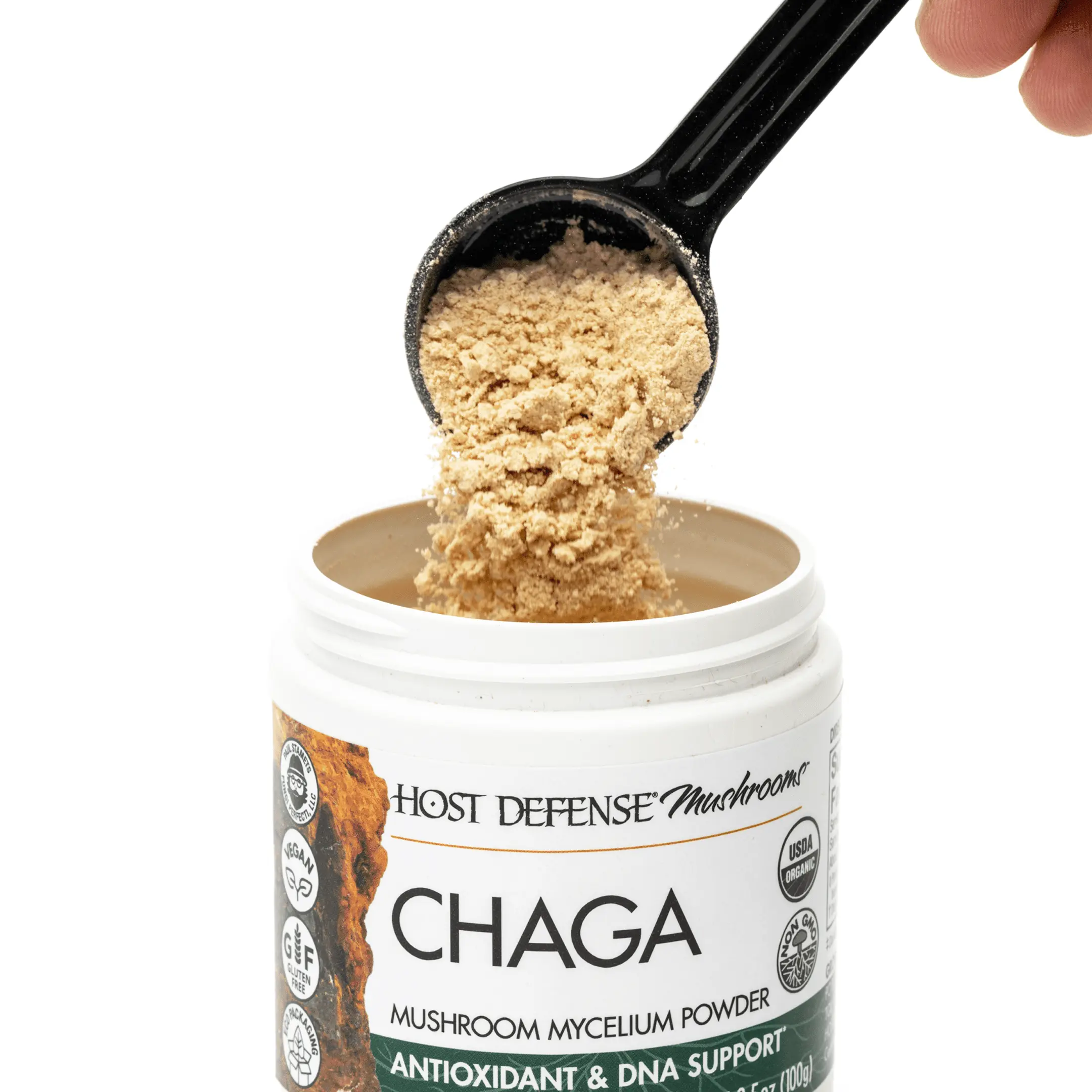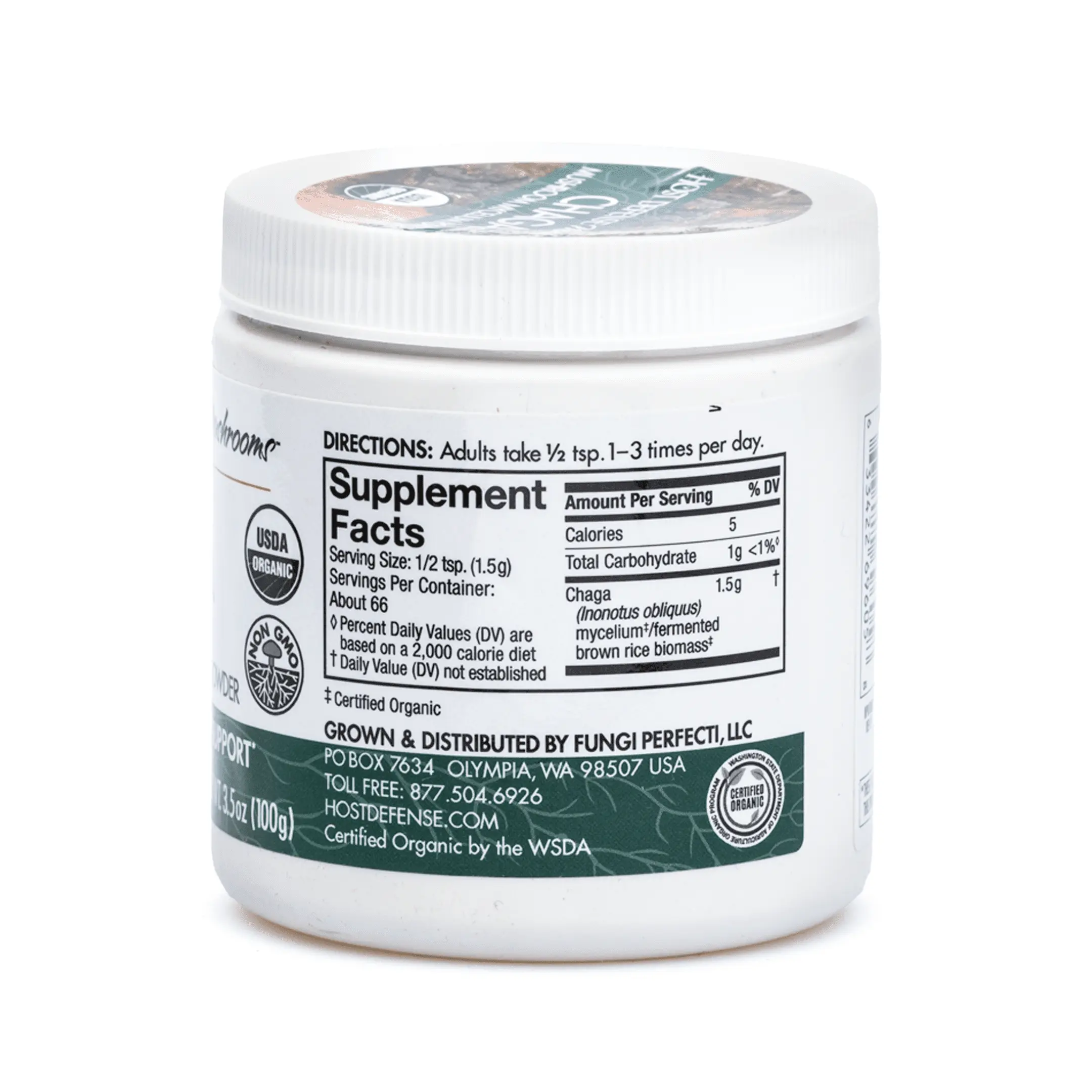 Each 3.5 ounce jar contains 100 grams of pure Chaga (Inonotus obliquus) mycelium/fermented brown rice biomass extract. It is recommended to take one-half teaspoon twice daily. All Host Defense mushrooms are sustainably cultivated, certified organic, and U.S.-grown mushrooms from the forest, to the farm, to the customer. All products are third-party lab tested, gluten-free, vegan-friendly, and non-GMO.