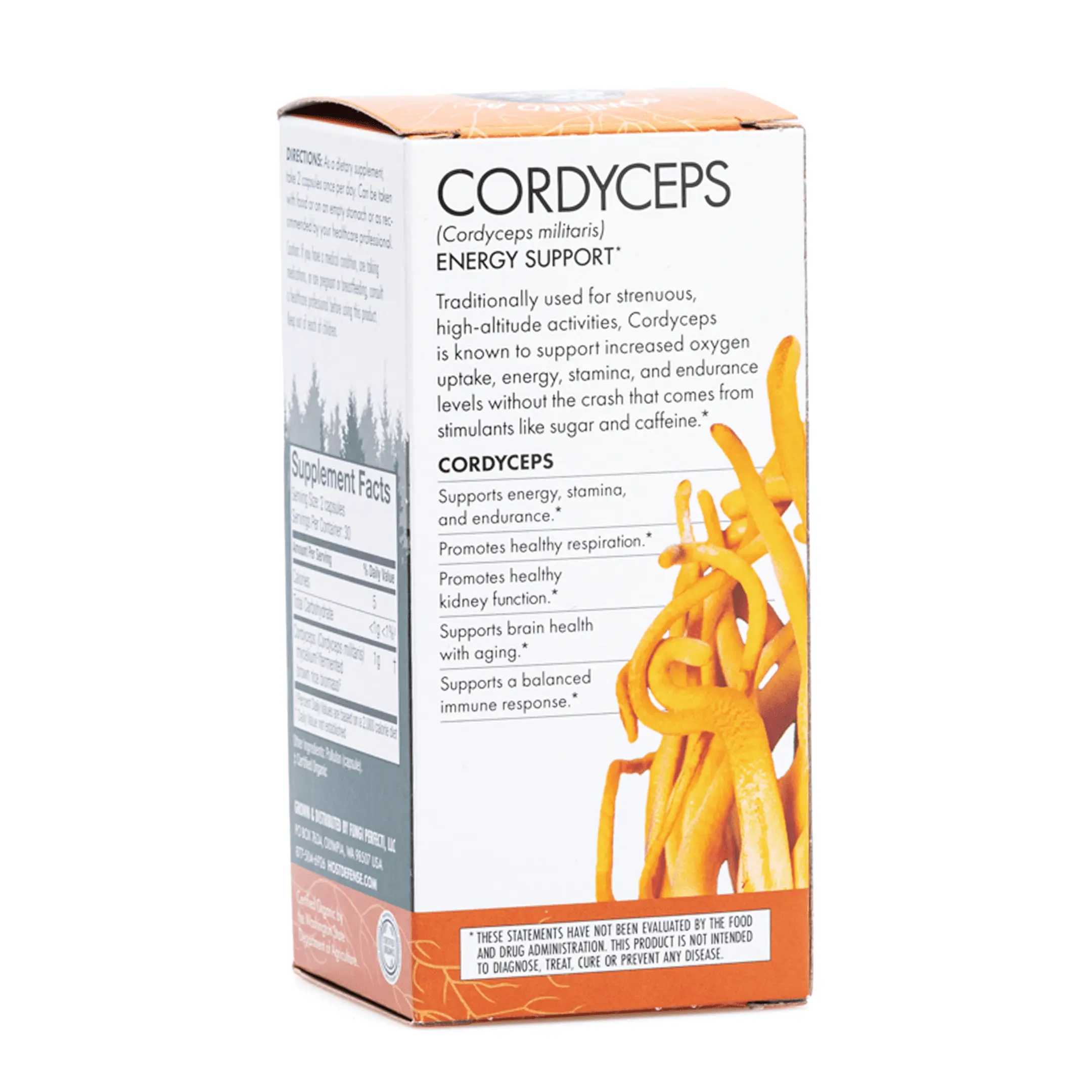 Each bottle contains 60 scientifically crafted capsules that contain pure Cordyceps (cordyceps militaris) mycelium/fermented brown rice biomass extract. It is recommended to take two capsules a day with or without food. All Host Defense mushrooms are sustainably cultivated, certified organic, and U.S.-grown mushrooms from the forest, to the farm, to the customer. All products are third-party lab tested, gluten-free, vegan-friendly, and non-GMO.