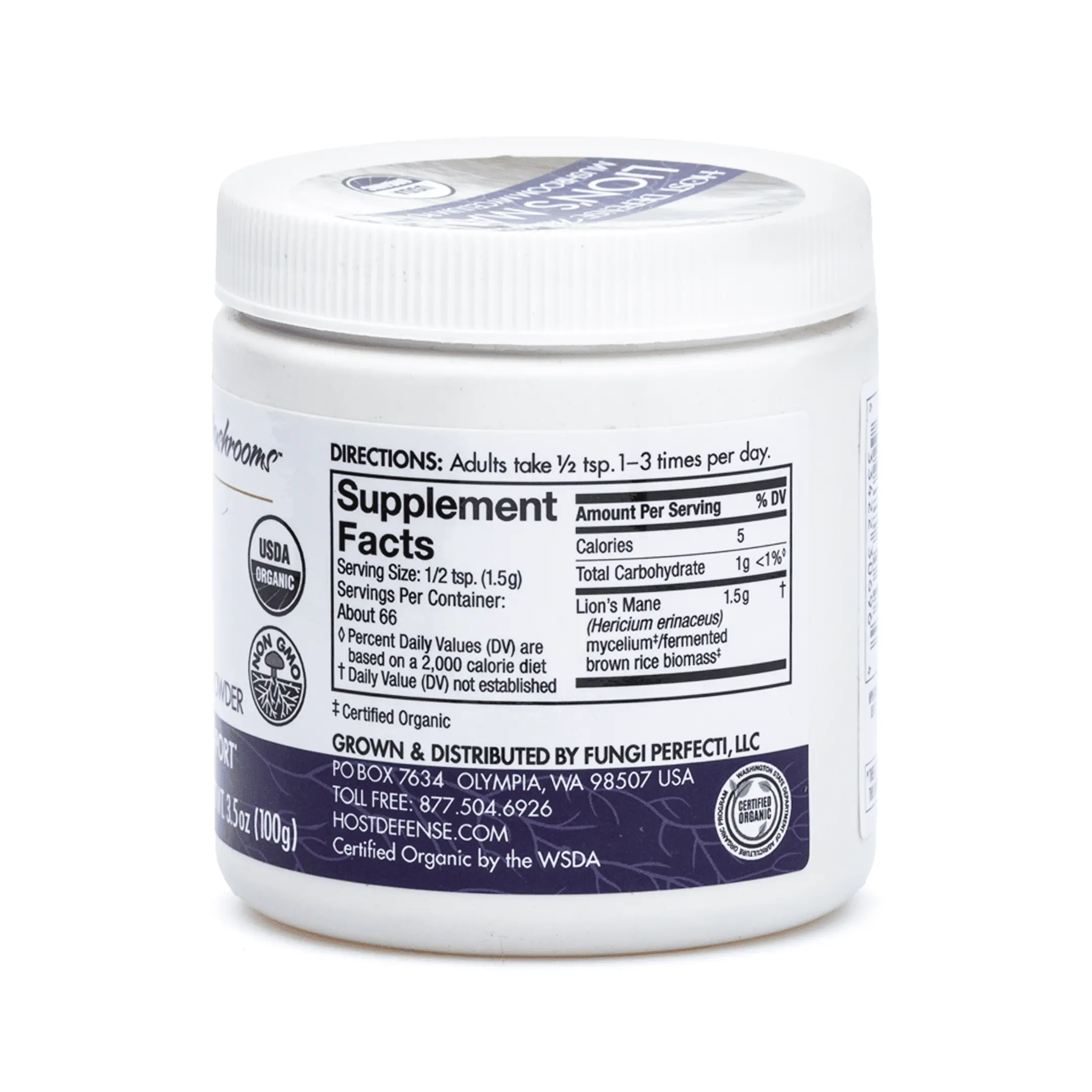 Each 3.5 ounce jar contains pure Lion’s Mane (Hericium erinaceus) mycelium/fermented brown rice biomass powder. It is recommended to take one-half teaspoon twice daily with or without food. Host Defense mushrooms are sustainably cultivated, certified organic, and U.S.-grown mushrooms from the forest, to the farm, to the customer. All products are third-party lab tested, gluten-free, vegan-friendly, and non-GMO.