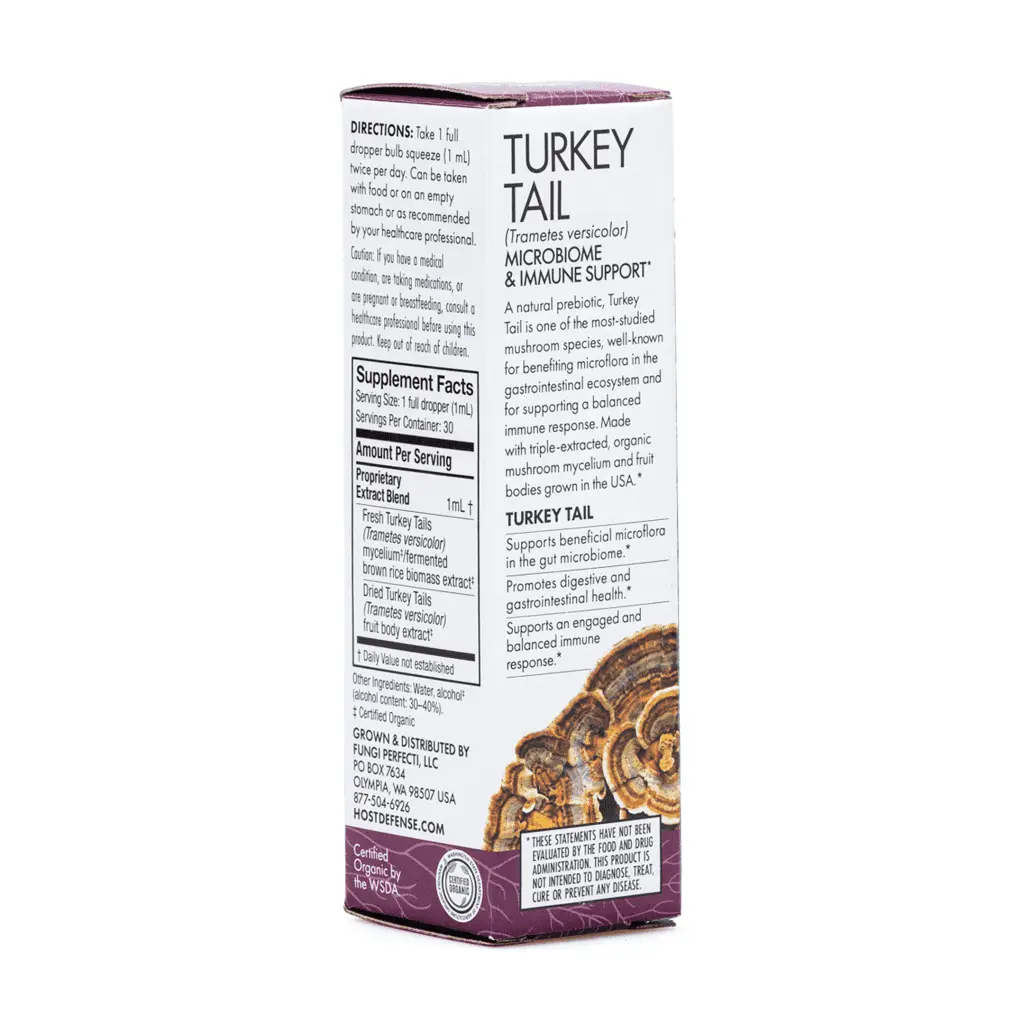 Each 1 ounce bottle contains pure Turkey Tail (Trametes versicolor) mycelium/fermented brown rice biomass extract. It is recommended to take one milliliter daily with or without food. All Host Defense mushrooms are sustainably cultivated, certified organic, and U.S.-grown mushrooms from the forest, to the farm, to the customer. All products are third-party lab tested, gluten-free, vegan-friendly, and non-GMO.